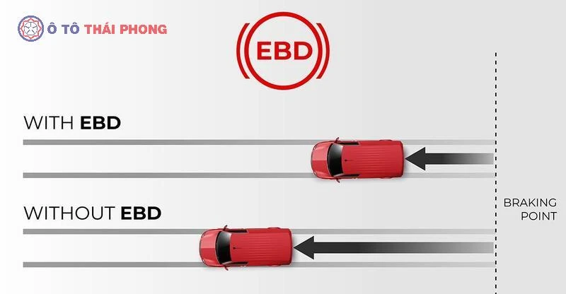 Kết hợp cùng ABS là hệ thống phân phối lực phanh EBD, có nhiệm vụ phân bổ lực phanh phù hợp đến từng bánh xe theo tải trọng thực tế. Điều này giúp rút ngắn quãng đường phanh và nâng cao độ an toàn khi xe chở hàng nặng hoặc phanh gấp.